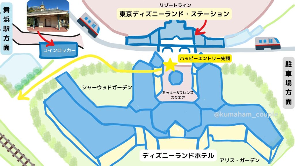 ディズニーランドの、ハッピーエントリー専用エントランスは上図の位置です!